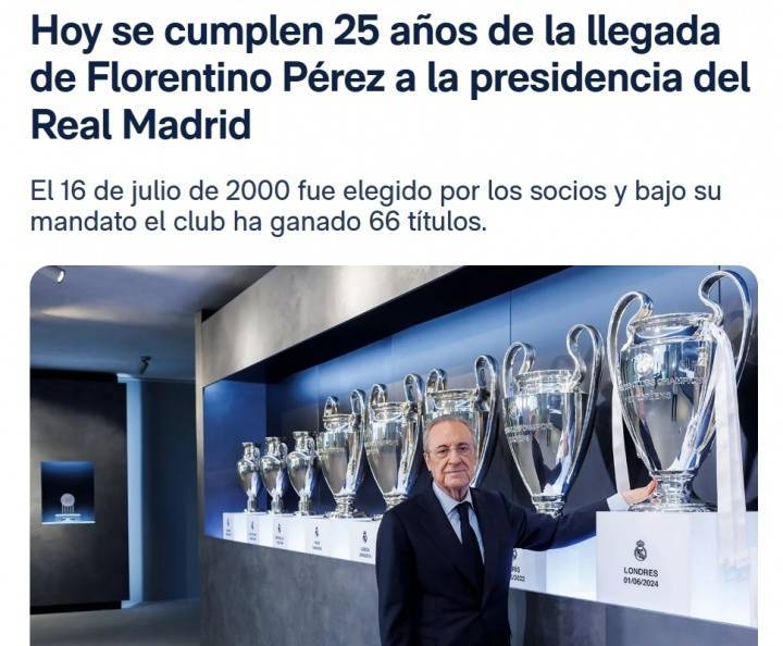 直播吧07月16日讯 皇马官方发文:今日是弗洛伦蒂诺担任皇家马德里主席25周年。球队在他的领导下,总计赢得了66个冠军。