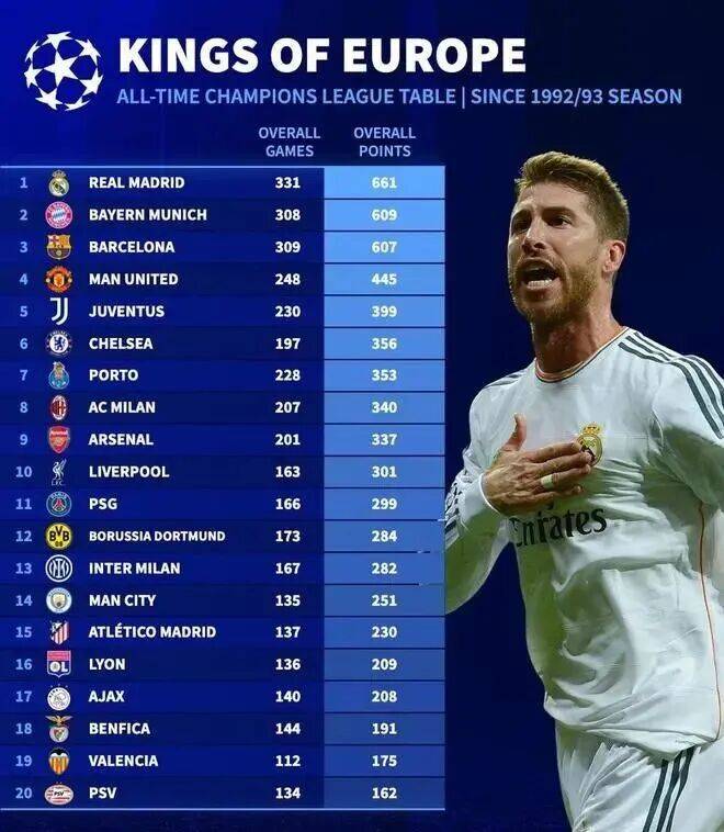 所以,真正让皇萨仁脱颖而出的,不是冠军数量,而是欧冠总积分。